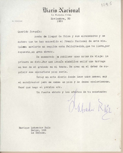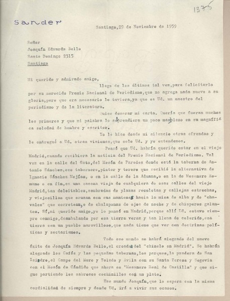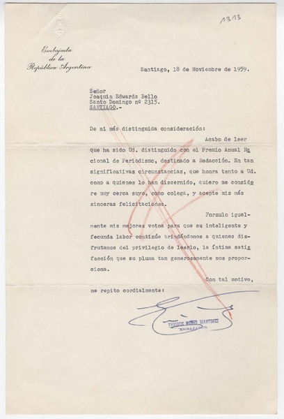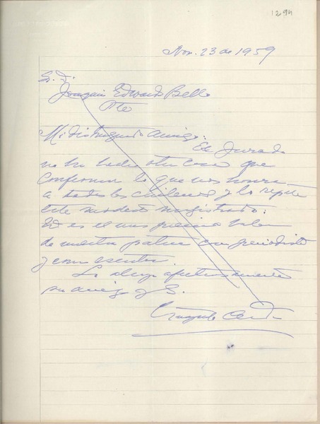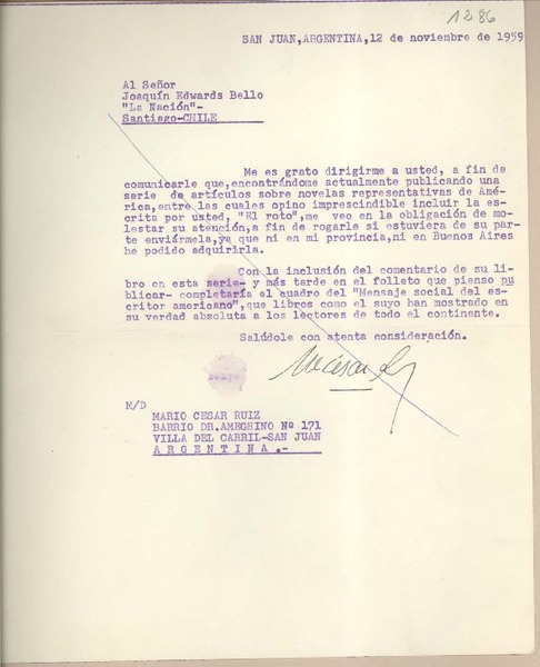 [Carta] 1959 noviembre 12, San Juan, [Argentina] [a] Joaquín Edwards Bello [manuscrito] Mario César Ruiz.