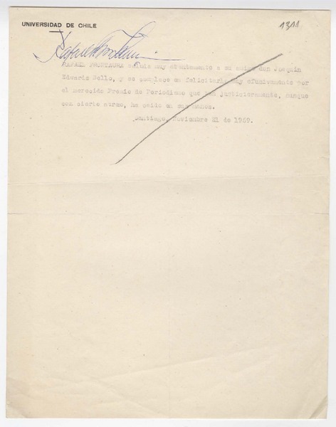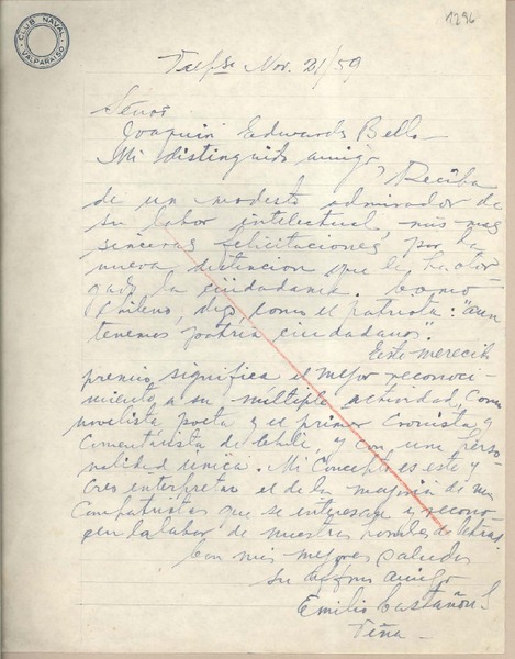 [Carta] 1959 noviembre 18, Santiago, Chile [a] Edwards Bello, Joaquín [manuscrito] Enrique Montes Martínez.