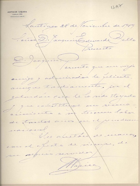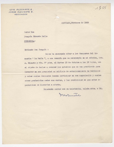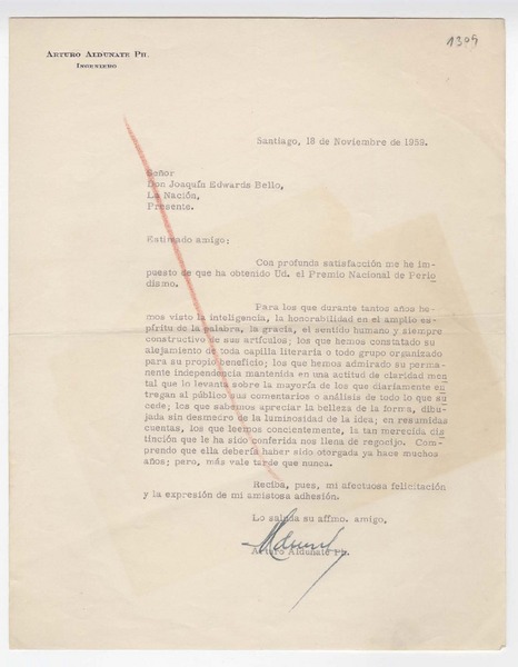 [Carta] 1959 noviembre. 18, Santiago, [Chile] [a] Joaquín Edwards Bello [manuscrito] Arturo Aldunate Phillips.