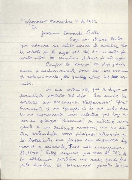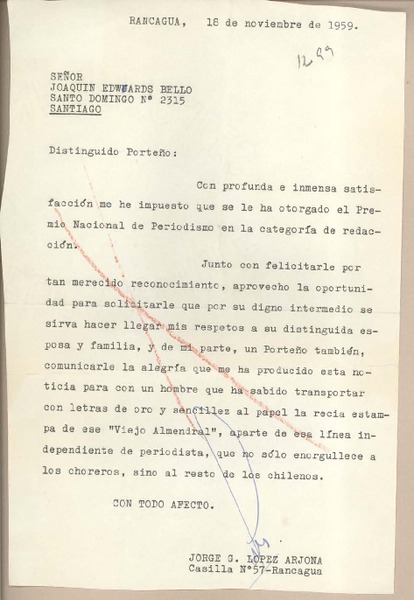 [Carta] 1959 diciembre 4, Valparaíso, [Chile] [a] Joaquín Edwards Bello [manuscrito] A. Rodrigo.