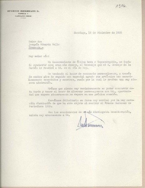 [Carta] 1959 diciembre 15, Santiago, [Chile] [a] Joaquín Edwards Bello [manuscrito] Eugenio Heiremans D.
