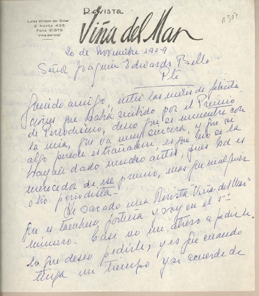 [Carta] 1959 noviembre 18, Santiago, Chile [a] Joaquín Edwards Bello [manuscrito] Walter Howe.