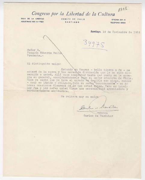 [Carta] 1959 noviembre 19, Santiago, [Chile] [a] Joaquín Edwards Bello [manuscrito] Carlos de Baráibar.