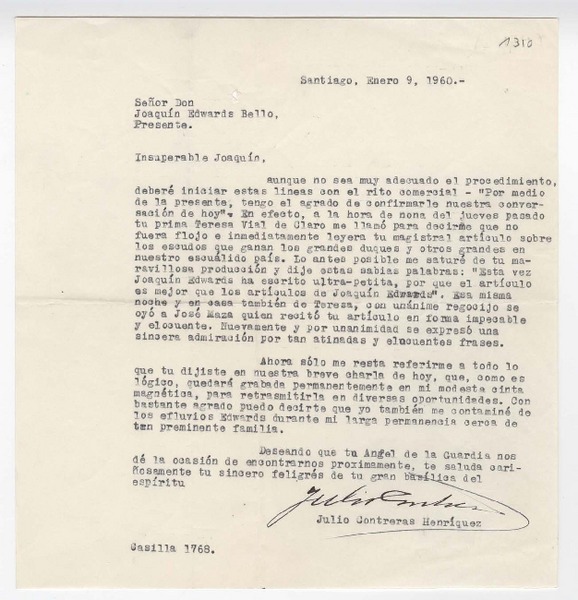 [Carta] 1953, [Santiago, Chile] [a] Joaquín Edwards Bello [manuscrito] Elena Sanhueza O.