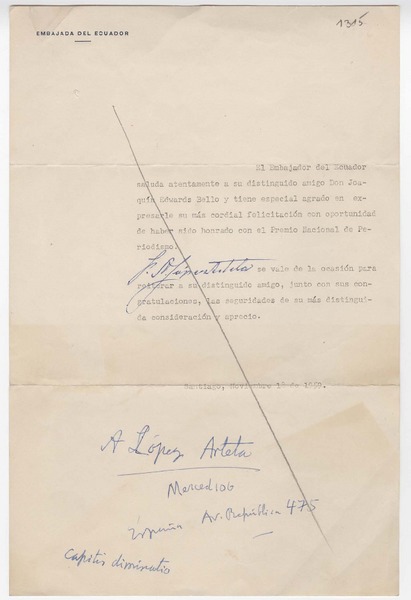 Edwards Bello, Joaquín - Autores ecuatorianos - López Arteta, F. A. - Manuscritos ecuatorianos - Autores chilenos - Correspondencia