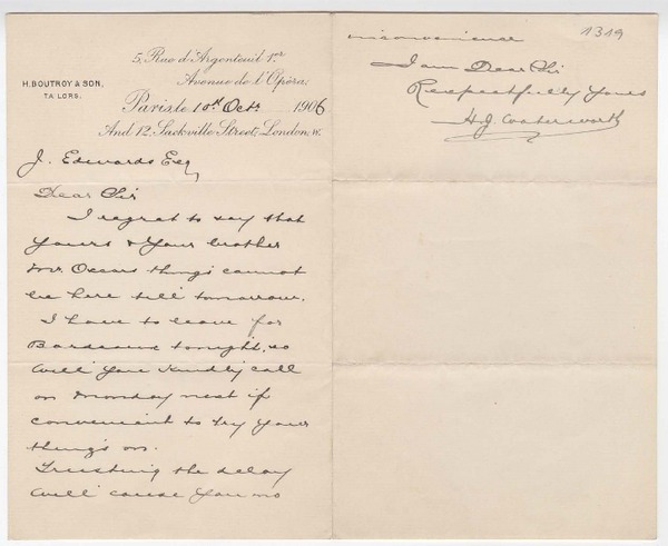 [Carta] 1906 octubre 10, Paris, [Francia] [a] Joaquín Edwards G. [manuscrito] H. G. Waterwoth.