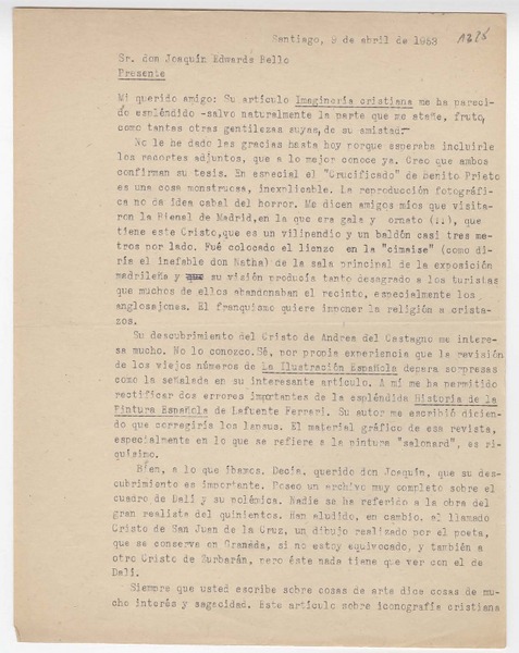 [Carta] 1953 abril 9, Santiago [Chile] [a] Joaquín Edwards Bello [manuscrito] Antonio R. Romera.