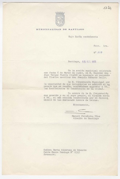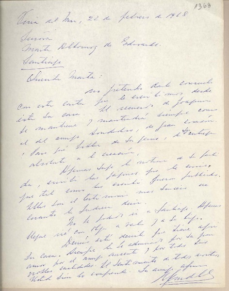 [Carta] 1968 marzo 15, Santiago [Chile][a] Marta Albornoz [manuscrito] Manuel Fernández Díaz.