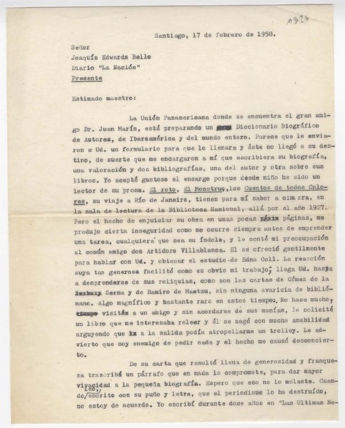 [Carta] 1958 febrero 17, Santiago [Chile] [a] Joaquín Edwards Bello [manuscrito] Luis Merino Reyes.