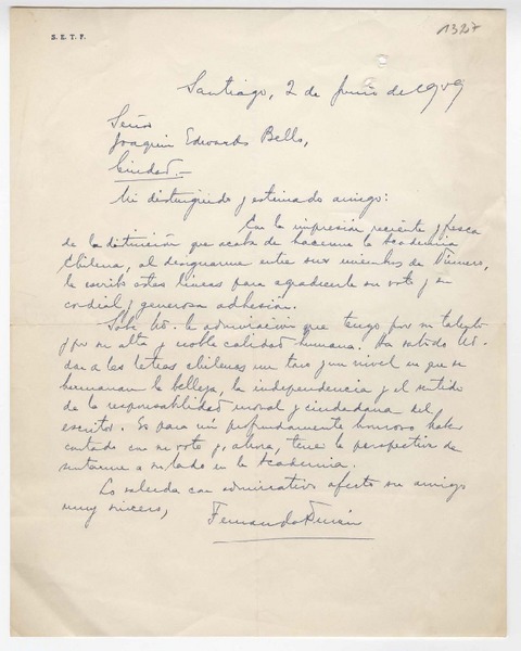 [Carta] 1959 junio 2, Santiago [Chile] [a] Joaquín Edwards Bello [manuscrito] Fernando Durán Villarreal.