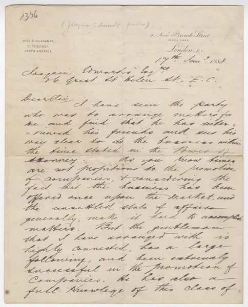 [Carta] 1883 enero 17, Londres, Inglaterra [a] Joaquín Edwards G. [manuscrito] José D. Husbands.