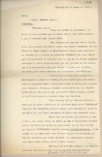 [Carta] 1955 marzo 30, Santiago, [Chile] [a] Joaquín Edwards Bello [manuscrito] Ramón Cisternas C.