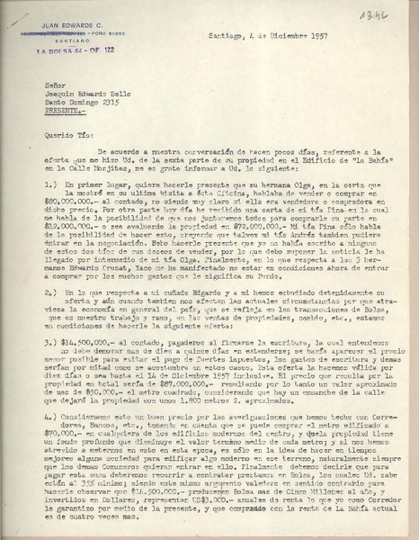 [Carta] 1957 diciembre 4, Santiago, [Chile] [a] Joaquín Edwards Bello [manuscrito] Juan Edwards C.