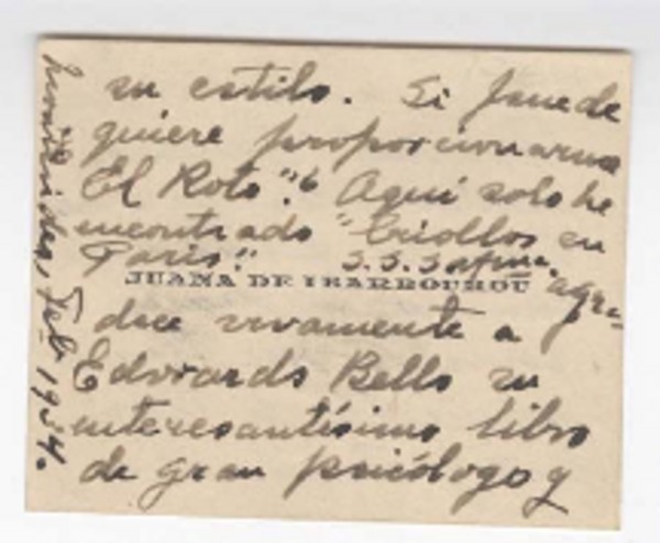 [Tarjeta] 1934 febrero, Montevideo, [Uruguay] [a] Joaquín Edwards Bello [manuscrito] Juana de Ibarbourou.