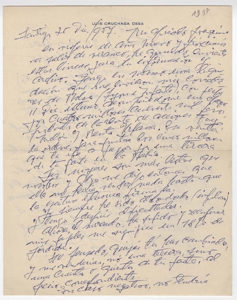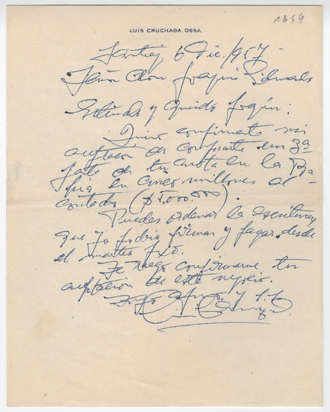 [Carta] 1957, diciembre 6, Santiago, [Chile] [a] Joaquín Edwards Bello [manuscrito] Luis Cruchaga O.