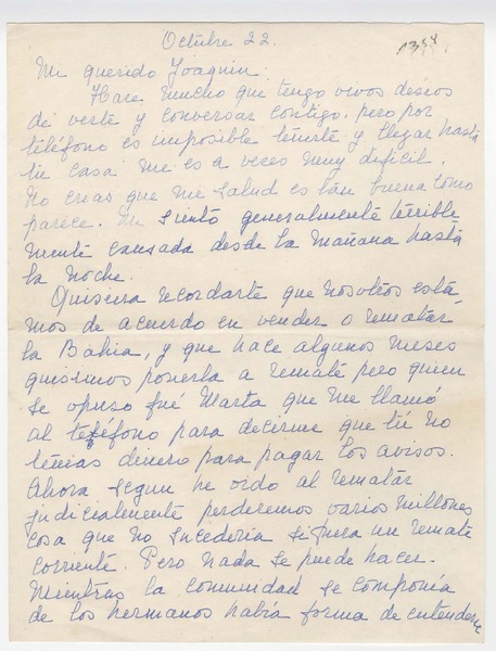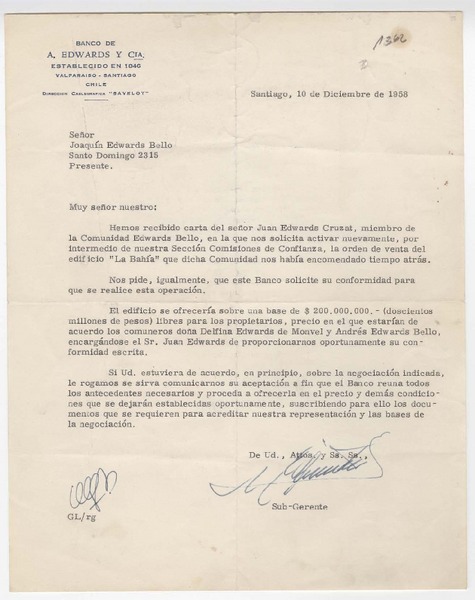 [Carta] 1958 diciembre 10, Santiago, Chile [a] Joaquín Edwards Bello [manuscrito] Banco de A. Edwards y Cía.