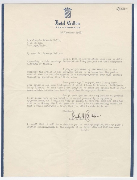 [Carta] 1938 noviembre 20, Santiago, Chile [a] Joaquín Edwards Bello [manuscrito] Duke N. Banks.