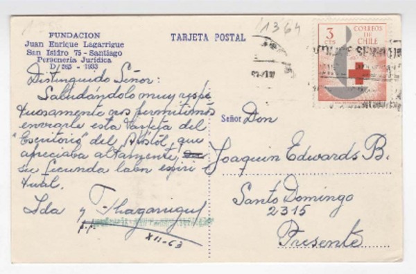 [Tarjeta postal] 1963 diciembre, Santiago, Chile [a] Joaquín Edwards Bello [manuscrito] Federico Lagarrigue.
