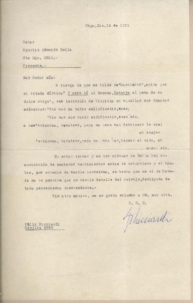 [Carta] 1951 diciembre 14, Santiago, [Chile] [a] Joaquín Edwards Bello [manuscrito] Félix Ricciardi.