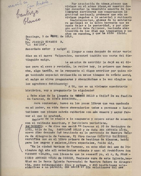 [Carta] 1946 mayo 15, Santiago, [Chile] [a] Joaquín Edwards Bello [manuscrito] Carlos Rojas Contreras.
