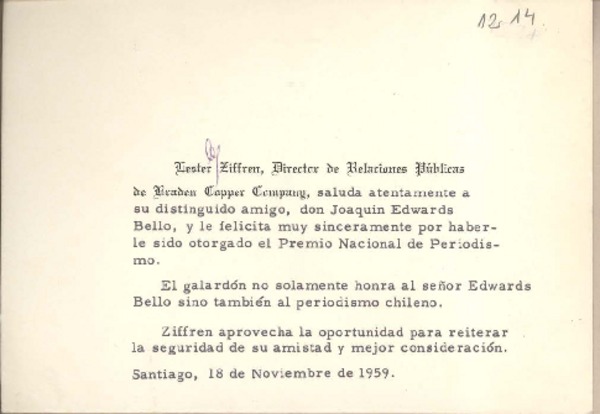 [Tarjeta] 1959 noviembre 18, Santiago, [Chile] [a] Joaquín Edwards Bello [manuscrito] Lester Ziffren.
