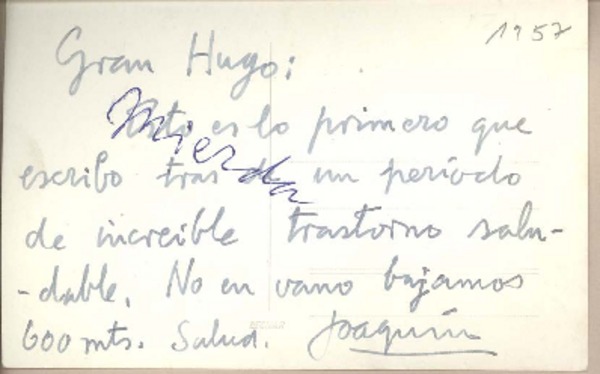 [Tarjeta Postal] [1960], [Valparaíso, Chile] [a] Gran Hugo [manuscrito] Joaquín Edwards Bello.