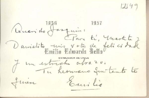 [Tarjeta] 1957, [La Habana, Cuba] [a] Joaquín Edwards Bello [manuscrito] Emilio Edwards Bello.