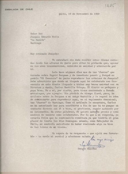 [Carta] 1959 noviembre 16, Quito, [Ecuador] [a] Joaquín Edwards Bello [manuscrito] Sergio Huneeus.
