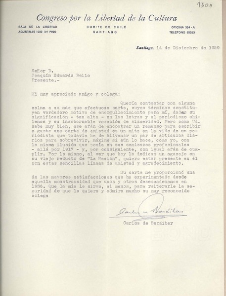 [Carta] 1959 diciembre 14, Santiago, [Chile] [a] Joaquín Edwards Bello [manuscrito] Carlos de Baráibar.