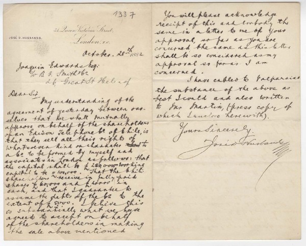 [Carta] 1882 octubre 28, Londres, Inglaterra [a] Joaquín Edwards G. [manuscrito] José D. Husbands.