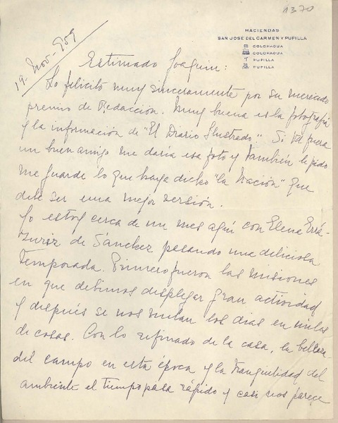 [Carta] 1959 noviembre 19, Colchagua, [Chile] [a] Joaquín Edwards Bello [manuscrito] A.G.H.