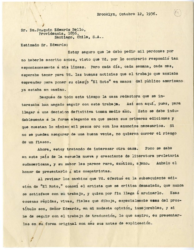 [Carta] 1936 octubre 12, Brooklyn, Nueva York [a] Joaquín Edwards Bello, Santiago, Chile [manuscrito] Victoria Ferguson.