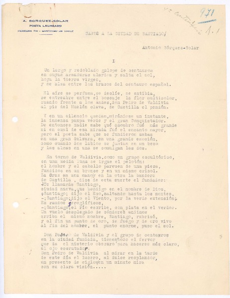 Canto a la ciudad de Santiago [manuscrito] Antonio Bórquez Solar.