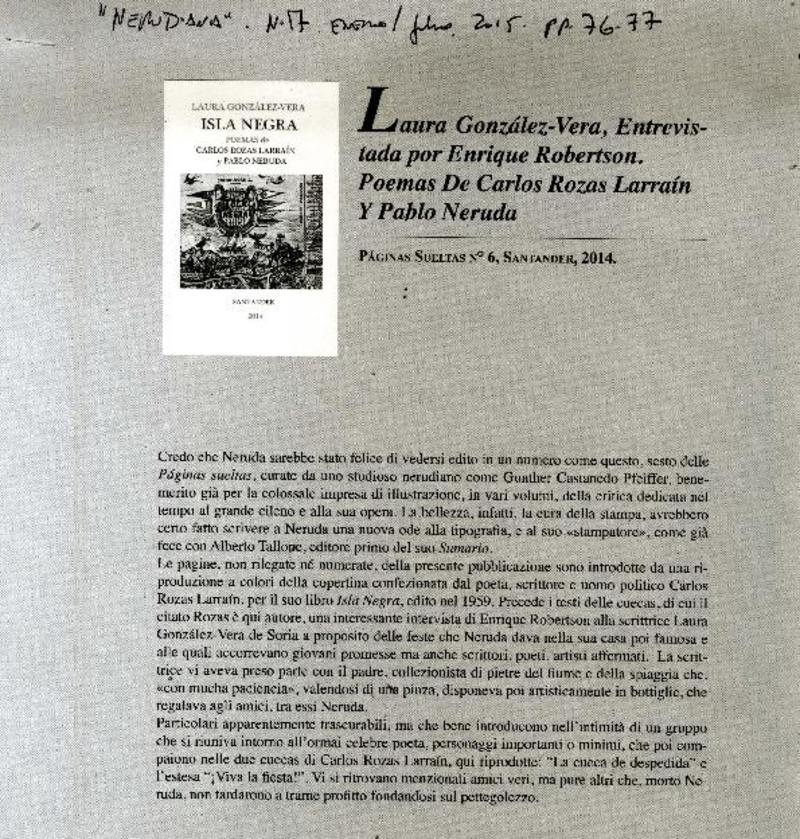 Laura González-Vera, entrevistada por Enrique Robertson. Poemas de Carlos Rozas Larraín y Pablo Neruda. [artículo]