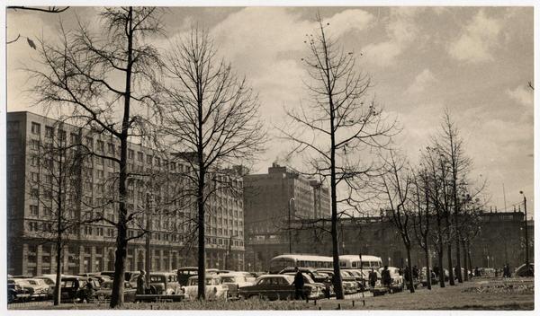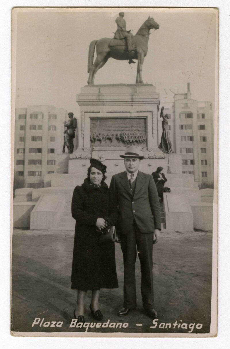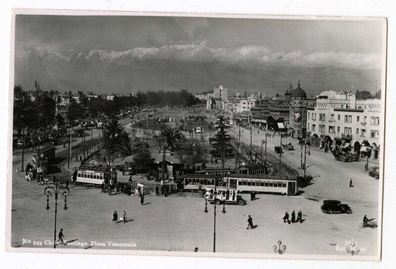 Santiago (Chile : Ciudad) - Tranvías - Avenida Libertador Bernardo O'Higgins (Santiago, Chile) - Pérgolas - Iglesia de San Francisco (Santiago, Chile) - Automóviles antiguos y clásicos - Fotógrafos - Edificios históricos - Arquitectura - Fotografías - Arquitectura religiosa - Historia
