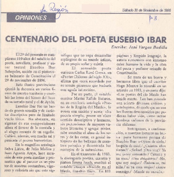 Centenario del poeta Eusebio Ibar [artículo]José Vargas Badilla.