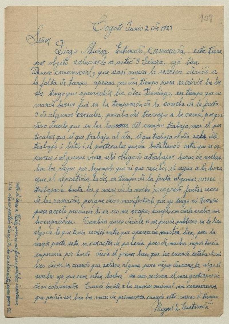 Cogotí, Chile [a] Diego Muñoz Carta, [1953] junio 2, [manuscrito] Miguel Luis Castañeda.