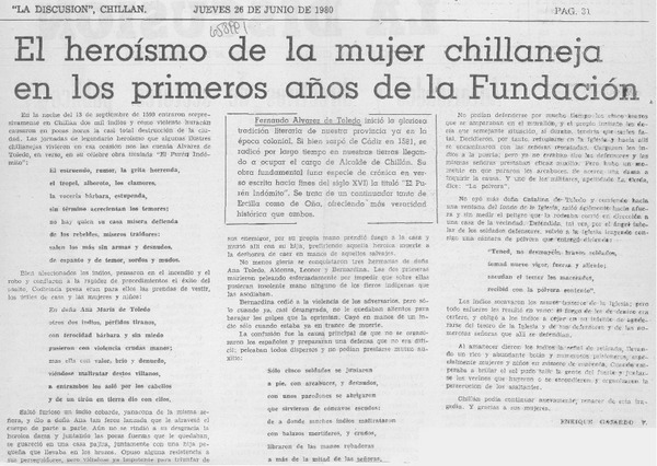 El heroísmo de la mujer chillaneja en los primeros años de la fundación [artículo] Enrique Gajardo Villarroel.