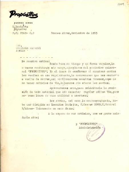 [Carta] 1953, nov. 11, Buenos Aires, Argentina [a] Gabriela Mistral, Italia [manuscrito] Administración de periódico Propósitos.