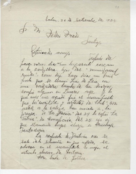 [Carta] 1924 sep. 26, Talca, Chile [a] Pedro Prado [manuscrito] Alfonso M. Escudero.