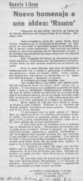 Nuevo homenaje a una aldea: "Rauco" [artículo] Alfonso Larrahona Kästen.