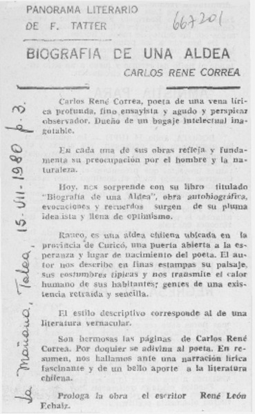 Biografía de una aldea - Correa, Carlos René - Autores chilenos - Rauco (Chile)