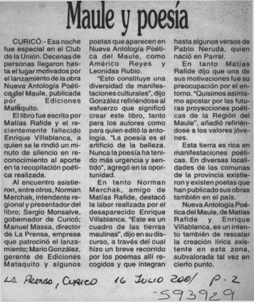 Matías Rafide y Enrique Villablanca, "Nueva antología poética del Maule" [artículo] José Arraño Acevedo
