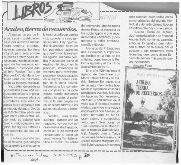 LETELIER LLONA, MARTA - ACULEO, TIERRA DE RECUERDOS