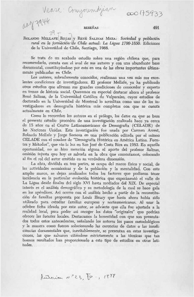 Presentación del estudio "Sociedad y población rural en la formación de Chile actual, La Ligua 1700-1850" de Rolando Mellafe y René Salinas [artículo] Ricardo Krebs W.