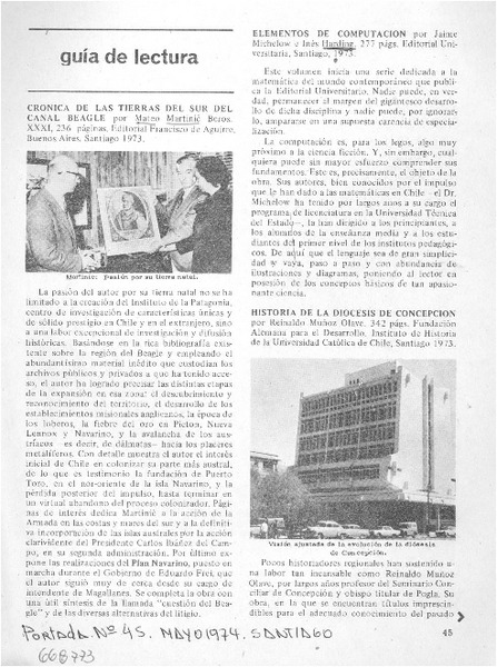 Harding, Inés - Urrutia, Jorge - Monckeberg, Fernando - Michelow, Jaime - Martinic Beros, Mateo - Autores chilenos - Crónica de las tierras del sur del canal Beagle - Jaque al subdesarrollo - Historia de la música en Chile - Claro Valdés, Samuel - Elementos de computación