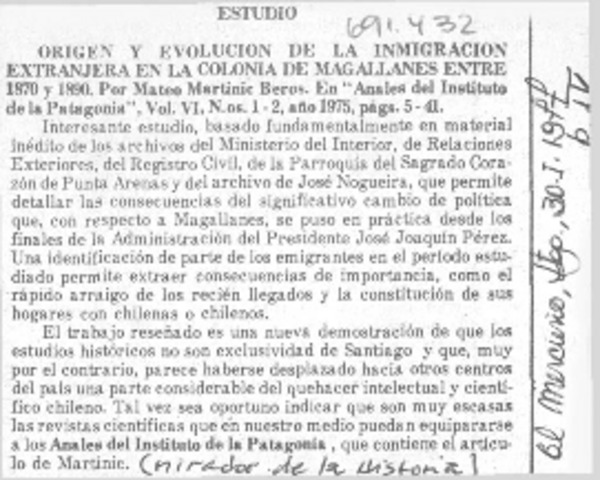Autores chilenos - Martinic Beros, Mateo - Magallanes, Hernando de - Origen y evolución de la inmigración extranjera en la colonia de Magallanes entre 1870 y 1890