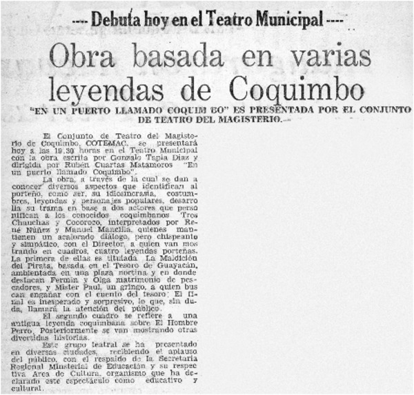 Se iniciaron ensayos de obra teatral dedicada a Coquimbo. [artículo]