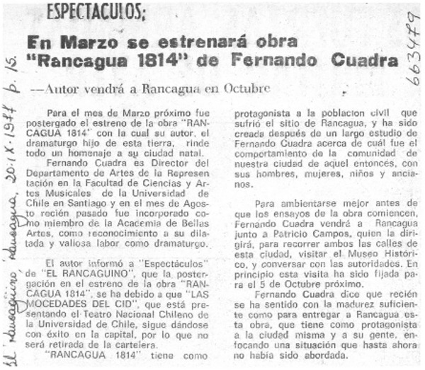 En marzo se estrenará obra "Rancagua 1814" de Fernando Cuadra. [artículo]