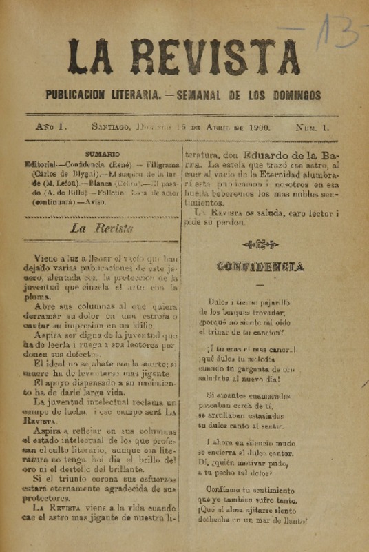La Revista : periódico literario ilustrado de los lunes organo de la Academía Literaria Ricardo Fernández M.